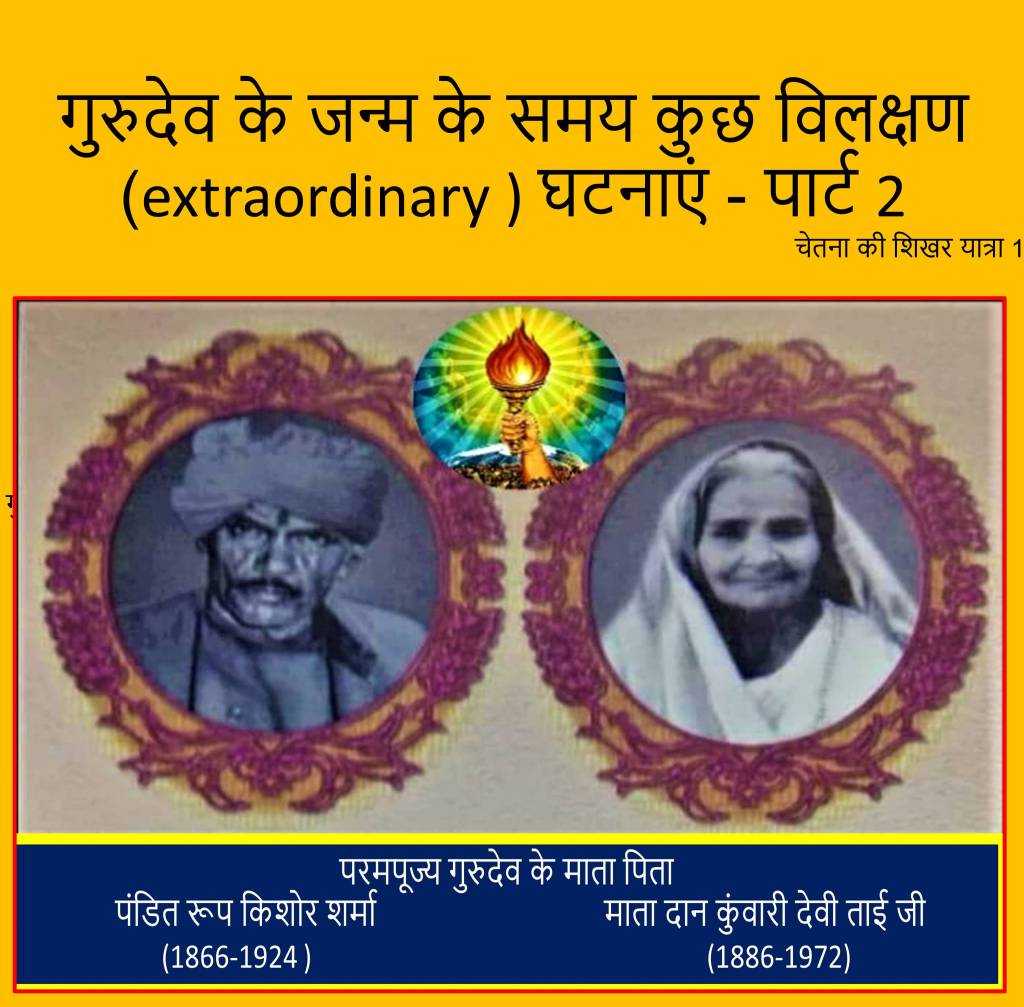 हमारे पूज्यवर का जन्म 20 सितम्बर 1911 आश्विन कृष्ण पक्ष की त्रयोदशी को प्रातः 9 बजे हुआ। पितृपक्ष चल रहा था। सनातन धर्म की मान्यता के अनुसार इन दिनों में शरीर छोड़ना और जन्म लेना दोनों ही विलक्षण हैं। कहते हैं पितृपक्ष में शरीर छोड़ने वालों