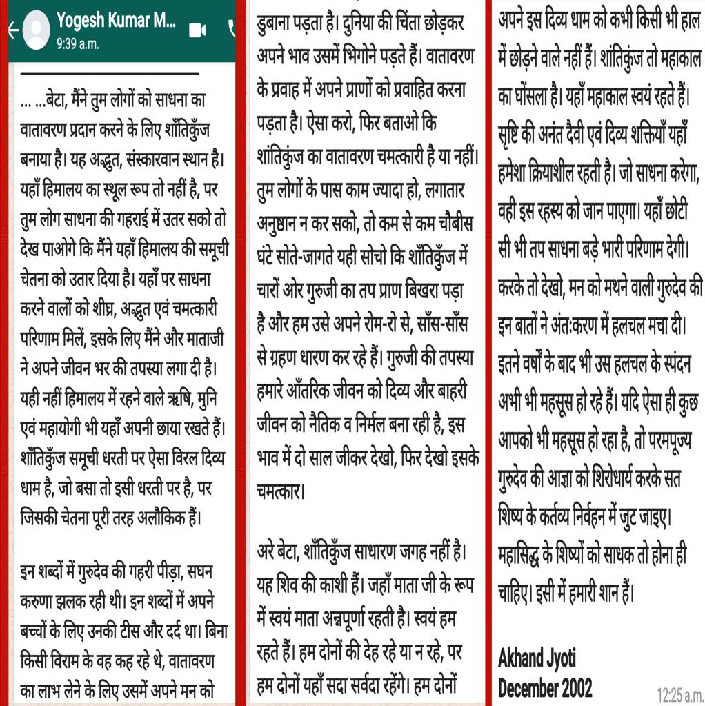 योगेश जी पिछले वर्ष हमें अखंड ज्योति संस्थान मथुरा में मिले और चतुर्वेदी जी के साथ उस ऐतिहासिक बिल्डिंग की videos शूट करने में सहायक रहे। हमारे सहकर्मी इस चैनल के वीडियो सेक्शन में यह ” भूतों वाली बिल्डिंग ” जिसमें गुरुदेव ने सपरिवार कई वर्ष व्यतीत किये देख सकते हैं। घीआ मंडी स्थित अखंड ज्योति संस्थान नामक बिल्डिंग हम सब के लिए किसी तीर्थ से कम नहीं होनी चाहिए।