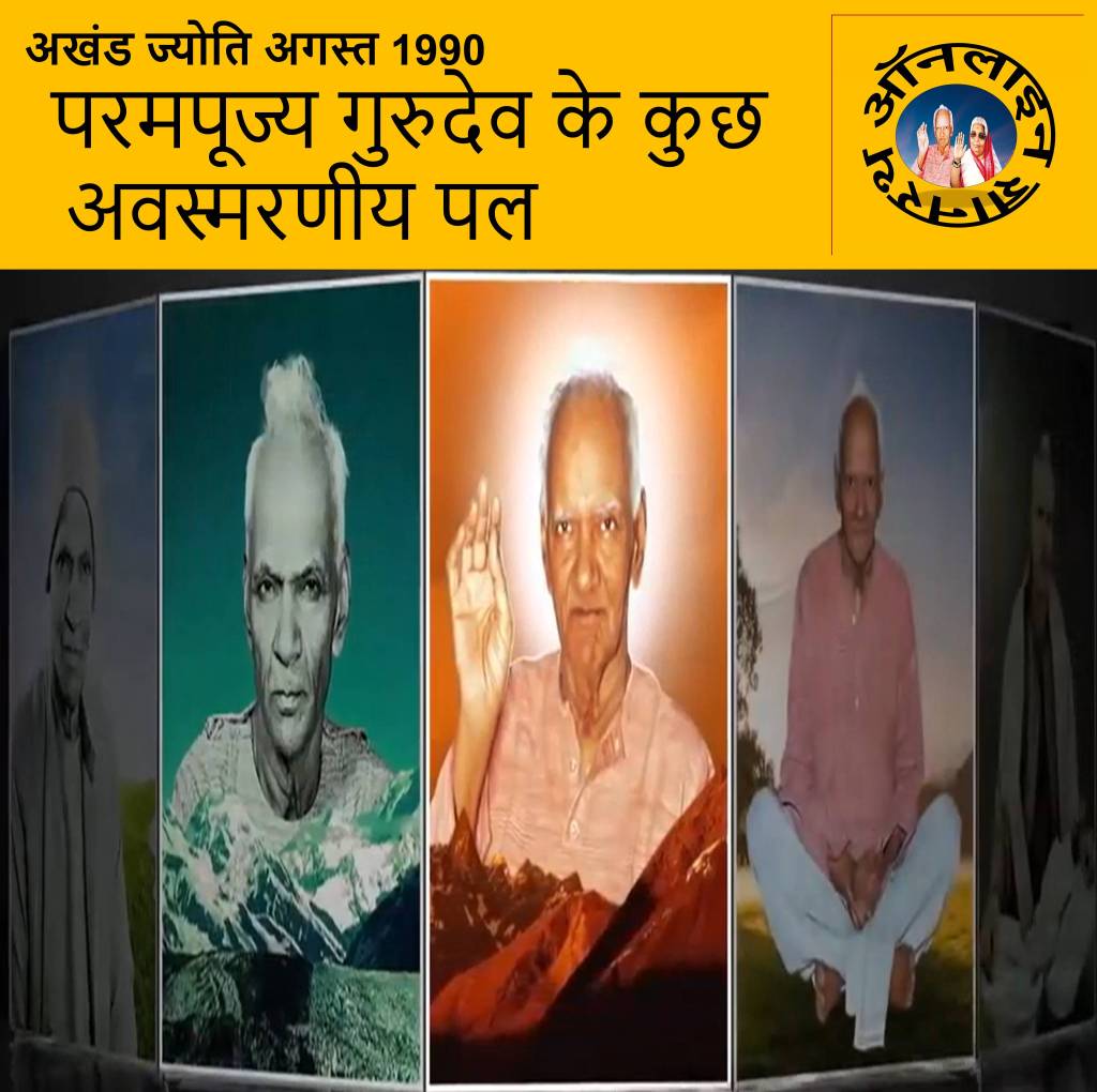 2 जून 1990 को गुरुदेव के स्वेच्छा से महाप्रयाण के उपरांत ब्रह्मवर्चस रिसर्च सेंटर के कार्यकर्ताओं ने एक अद्भुत प्रयास करके अखंड ज्योति पत्रिका का स्पेशल अंक निकाला। 200 पन्नों यह अंक सारे का सारा परमपूज्य गुरुदेव पर ही आधारित था। हमने इस अंक को कई बार पढ़ा और फिर मन हुआ कि इतने अच्छे संस्मरण ज्ञानरथ में शामिल होने चाहिए। तो प्रस्तुत है इस अंक में से कुछ चुने हुए पल। हो सकता है कि हमें इस को कई कड़ियों में लिखना पड़ेगा।