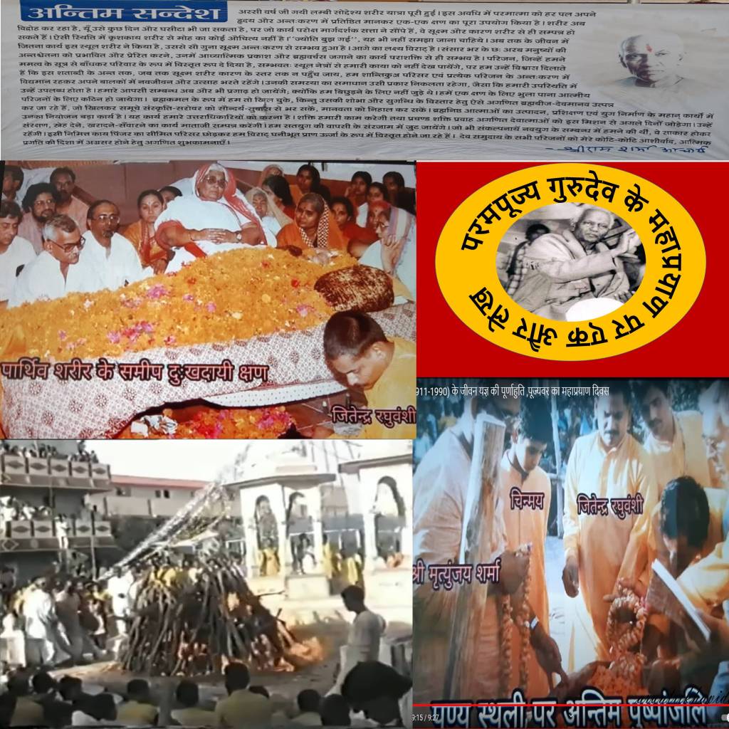 शांतिकुंज के कंप्यूटर कक्ष ( आज कल तो कंप्यूटर विभाग भोजनालय के सामने एक अलग बिल्डिंग में है ) के ऊपर जो बड़े हॉल के रूप में परमवंदनीय माताजी का कक्ष है, वहीं पर गुरुदेव का पार्थिव शरीर रखा गया था। महायोगी की महत् चेतना का दिव्य आवास रही, उनकी देह आज चेतनाशून्य थी। पास बैठी हुई वंदनीया माताजी एवं परिवार के सभी स्वजन वेदना से विकल और व्याकुल थे। माताजी की अंतर्चेतना को तो प्रातः प्रवचन में ही गुरुदेव के देह छोड़ने की बाते पता थी तब से लेकर अब तक वह अपने कर्तव्यों में लीन थीं। सजल श्रद्धा की सजलता जैसे हिमवत् हो गई थी, अब वह महावियोग के ताप से पिघल रही थी। अंतिम प्रणाम भी समाप्त हो गया, परंतु कुछ लोग अभी हॉल में रुके थे। प्रणाम करके नीचे उतर रहे एक कार्यकर्ता को एक वरिष्ठ भाई ने ही इशारे से रोक लिया। परमपूज्य गुरुदेव की पार्थिव देह को उठाते समय माताजी ने उसे बुलाया एवं भीगे स्वरों में कहा ,