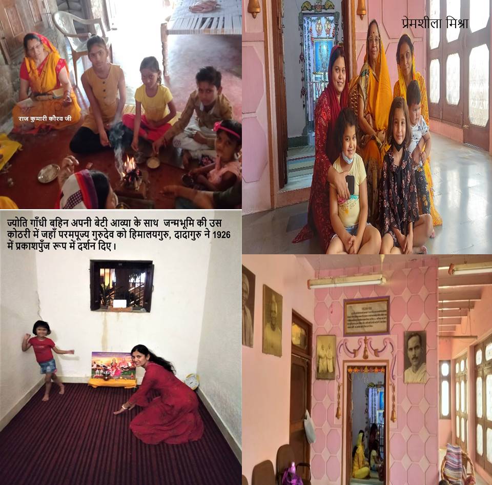 कल वाले शुभरात्रि सन्देश में जब हमने परमपूज्य गुरुदेव की जन्मस्थली हवेली के चित्र शेयर किये तो आदरणीय ज्योति बहिन जी ने 25 फरवरी 2021 के कुछ चित्र हमें एकदम भेज दिए। यूट्यूब की चित्र सीमा के कारण हम केवल उनका एक ही चित्र आपके समक्ष रख रहे हैं जिसमें बहिन जी अपनी बेटी आव्या के साथ उसी कोठरी में हैं जहाँ 96 वर्ष पूर्व दादागुरु ने प्रकाशपुंज में प्रकट होकर गुरुदेव को तीन पूर्व जन्मों के दर्शन कराये थे। हम बहिन जी का ह्रदय से धन्यवाद् करते हैं और सभी युवाओं से आग्रह करते हैं कि ऐसे सहकर्मियों से प्रेरणा लें। बहिन जी बालसंस्कार शाला चलाने के साथ,रविवार को ऑनलाइन गोष्ठी में भी सक्रीय हैं। ऑनलाइन ज्ञानरथ परिवार की समर्पित सहकर्मी आदरणीय राज कुमारी कौरव बहिन जी का धन्यवाद् करते हैं जिनके कारण हमें ज्योति जी का सम्पर्क प्राप्त हो पाया।
