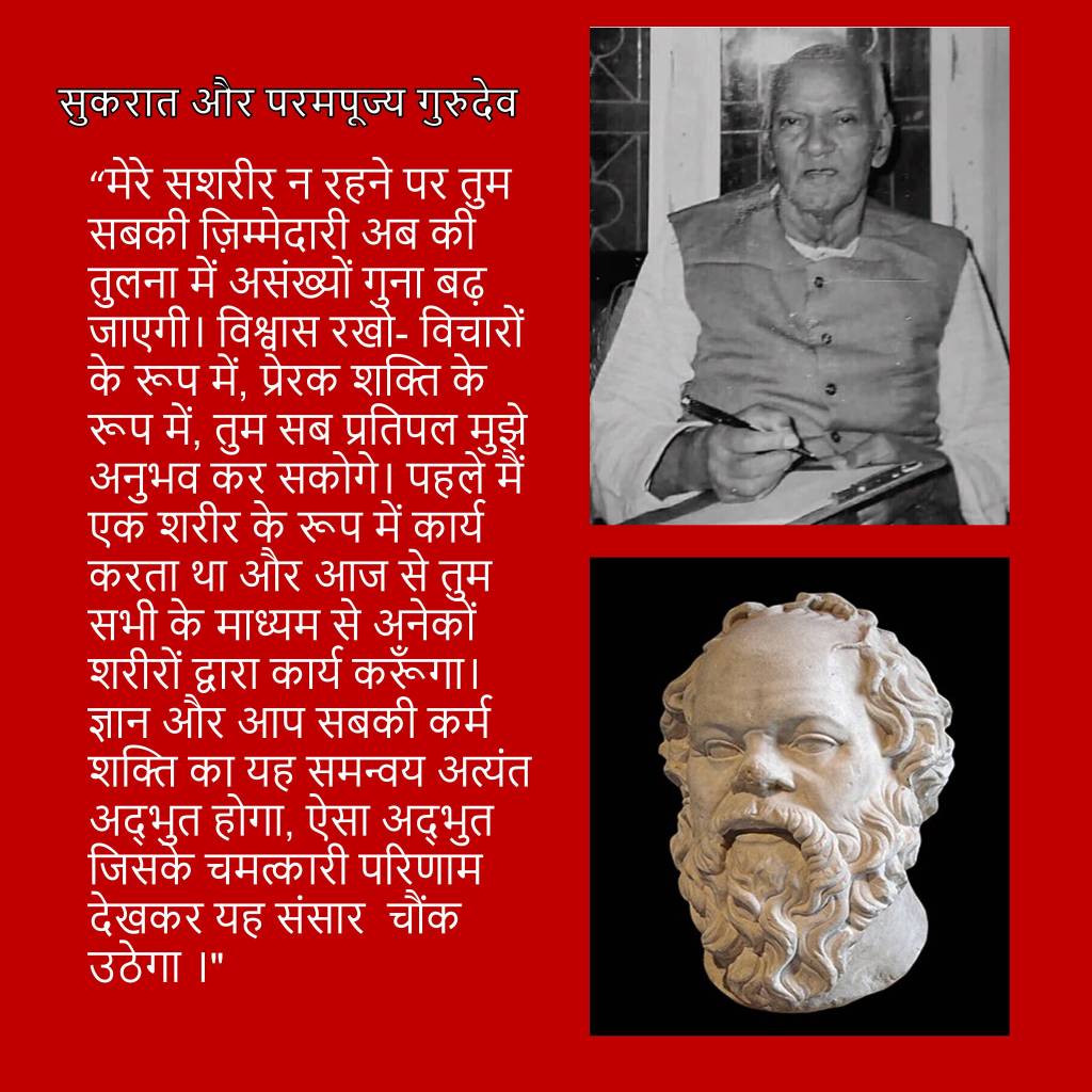 यूनान (Greece ) की राजधानी Athens में जन्मे यूनानी फिलासफर सुकरात अपने समय के बहुत ही बुद्धिमान और अति शिक्षित व्यक्तित्व के धनी थे । उस समय के लोगों के ज्ञान के स्तर को देखते हुए सुकरात का ज्ञान बहुत ही अधिक था।। यही कारण था कि वो उस समय की प्रचलित अवधारणाओं ,रूढ़ियों ओर अंधविश्वास ओर गलत धारणाओं का विरोध करते रहते थे। गुरुदेव की कार्य शैली भी तो ही थी, अभी अभी प्रकाशित वीडियो में हमने देखा गुरुवर को कितनी गलियां कहानी पड़ीं, यहाँ तक कि उन पर जानलेवा हमला भी हुआ।