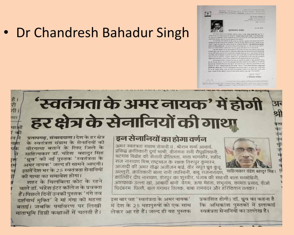 3. हमारे परम आदरणीय सहकर्मी डॉ चंद्रेश बहादुर सिंह ‘ध्रुव’ पर परम पूज्य गुरुदेव की अपार कृपा है जिनकी अनुकम्पा से भाई साहिब की 5वीं पुस्तक “स्वतंत्रता के अमर नायक” अविलंब आने वाली है। इस पुस्तक में 25 सैनानियों का वर्णन है जिनमें से एक हमारे परम पूज्य गुरुदेव भी हैं । 23 जनवरी के ‘दैनिक हिन्दुस्तान’ समाचार पत्र में स्वतन्त्रता प्राप्ति के अमृत महोत्सव में अनुपम उपहार के रूप में ‘स्वतन्त्रता के अमर नायक’ पुस्तक की संक्षिप्त झांकी दी गयी है जिसे हम आप सबके समक्ष प्रस्तुत कर रहे हैं। आइए हम सब डॉ चंद्रेश जी को अपनी शुभकामनाओं के साथ बधाई दें और उनकी पुस्तक को जन-जन तक पहुँचाने का संकल्प लें क्योंकि प्रतिभा कहीं भी हो उसका सार्थक विज्ञापन करना हमारा परम कर्तव्य है। हमारे सहकर्मी हमारी कार्यशैली से भलीभांति अपरिचित हैं कि प्रतिभा चाहे सात वर्ष की बच्ची काव्या की हो, चाहे युवा संजना की हो, ज्योति गाँधी जी की हो या फिर वरिष्ठ रेणु श्रीवास्तव बहिन जी/सुमनलता बहिन जी की हो, चिंगारी लगा कर explosion करना हमारा कर्तव्य है। इसी सामूहिक शक्ति पर हमें गर्व है।