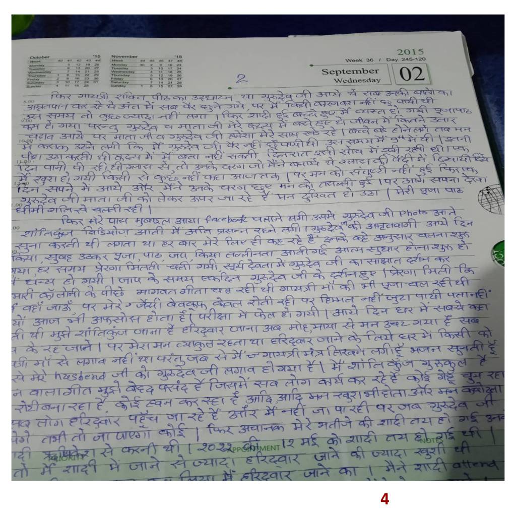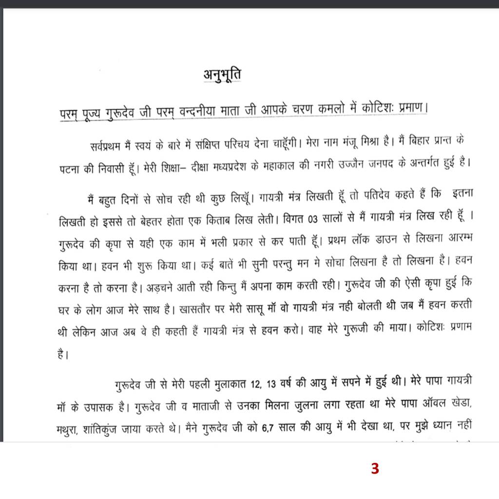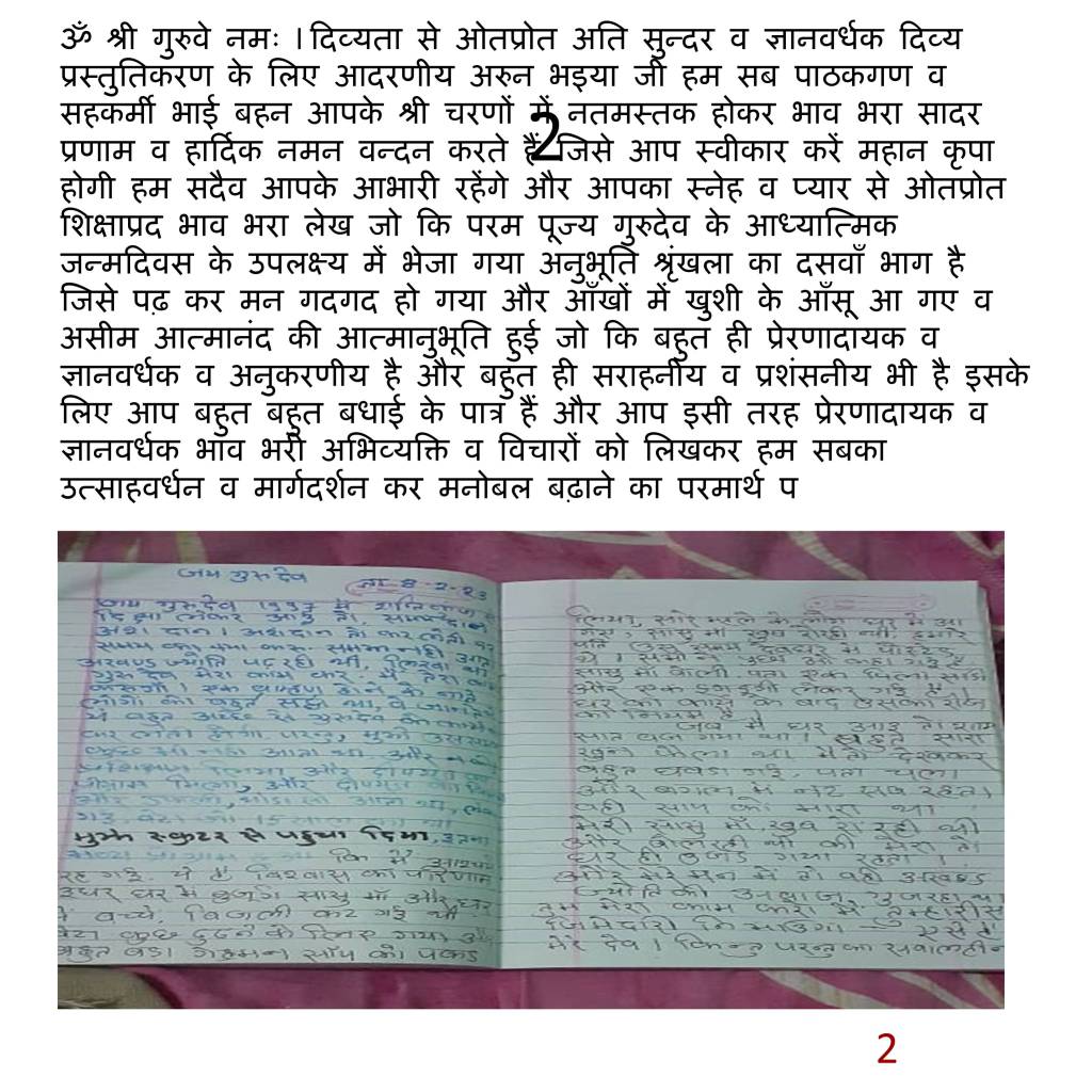 अनुभूति श्रृंखला का आरम्भ हमारी पर्सनल अनुभूति से हुआ था जिसमें हमने गुरुशक्ति के आगे टेक्नोलॉजी को झुकते देखा था। समापन(???) मंजू मिश्रा जी की अनुभूति से हुआ जिसमें हमनें श्रद्धा, विश्वास और गुरुभक्ति का एक दुर्लभ उदाहरण देखा। शायद हमीं ने इस सन्दर्भ में लिखा था कि अगर शिष्य में गुरुभक्ति हो तो, हिमालय के बियाबान जंगलों को भी चीरकर गुरु आपके समक्ष खड़ा होता है। शायद यह गुरुभक्ति ही थी जिसने बहिन जी को युगतीर्थ शांतिकुंज की पावन भूमि का स्पर्श करवा के ही दम लिया। इससे भी बढ़कर संयोग देखिये: बहिन जी ने इतना परिश्रम करके जब पहली बार अपनी अनुभूति handwritten form में भेजी तो हमारे तो होश ही उड़ गए कि बहिन जी ने कितनी श्रद्धा,समर्पण,निष्ठा से यह चार पेज लिखे थे, उन में से एक पेज का स्क्रीनशॉट स्लाइड नंबर 4 में दिखाया गया है। होश उड़ने वाली बात हम इसलिए लिख रहे हैं कि बहिन जी ने उस युग में इतना परिश्रम कर दिखाया है जब हम पेपर-पैन को भूलते जा रहे हैं। टेक्नोलॉजी ने हमारे हाथ ऐसे काट कर रख दिए हैं कि अगर कहीं हमें पैन लेकर पेपर पर कुछ पंक्तियाँ लिखनी पड़ जाएँ तो शायद बहुत बड़ी समस्या बन जाय क्योंकि आज सब कुछ तो फ़ोन और लैपटॉप कर रहे हैं। हमें तो यह सोचने की आवश्यकता भी नहीं है कि इस शब्द का spelling क्या है। वाह रे टेक्नोलॉजी !!!! जब इस स्तर का परिश्रम देखा तो हमसे रहा न गया और हमने उसी समय पढ़ने का प्रयास करना आरम्भ कर दिया, लगभग एक घंटा चारों पन्नों को बीच-बीच में zoom करकेपढ़ने का प्रयास करते रहे कि शायद कुछ बात बन जाए क्योंकि हम हिम्मत हारने वालों में से तो है नहीं। ज़ूम करने से शब्द blurr हो जाते थे और unzoom से बहुत ही साथ-साथ और नज़दीक थे। रात हो रही थी, सोने का समय निकट आ रहा था इसलिए इस प्रयास को अगले दिन के लिए पोस्टपोन करना पड़ा। अगले दिन उठते ही सबसे पहले गूगल महाराज से निवेदन किया और महाराज ने लगभग 5 घंटे हमारे साथ बैठ कर प्रयास किया लेकिन वह भी हथियार डाल कर चलते बने। अब हमारे पास एक ही विकल्प था कि बहिन जी को फिर से लिखने के लिए कहा जाये,लेकिन यह कहने के लिए साहस कहाँ से लाएं, जिन्होंने चार पेज इतने परिश्रम से लिखे थे, क्या वह फिर से लिख पायेंगें, उनका साहस नहीं टूट जायेगा और हमें जो गलियां पड़ेंगी वह अलग। खैर गुरुदेव से मार्गदर्शन मिला, बेटा अरुण जब ओखली में सिर दिया है तो डर किस बात का। गुरुदेव कह रहे थे , “सहकर्मियों की गालियां सिर आँखों पर, हमें तो हर किसी ने गलियां ही दी हैं, तो उठ बटोर साहस।” हमने गुरु निर्देश का पालन किया और बहिन जी को सारी कहानी लिख डाली। इस कहानी में जो सबसे महत्वपूर्ण वाक्य था,वह था “बहिन जी अगर कुछ पैसे देकर किसी से टाइप भी करवाना पड़े तो कोई बात नहीं, समयदान और अंशदान दोनों हो जायेंगें, ज्ञानदान तो