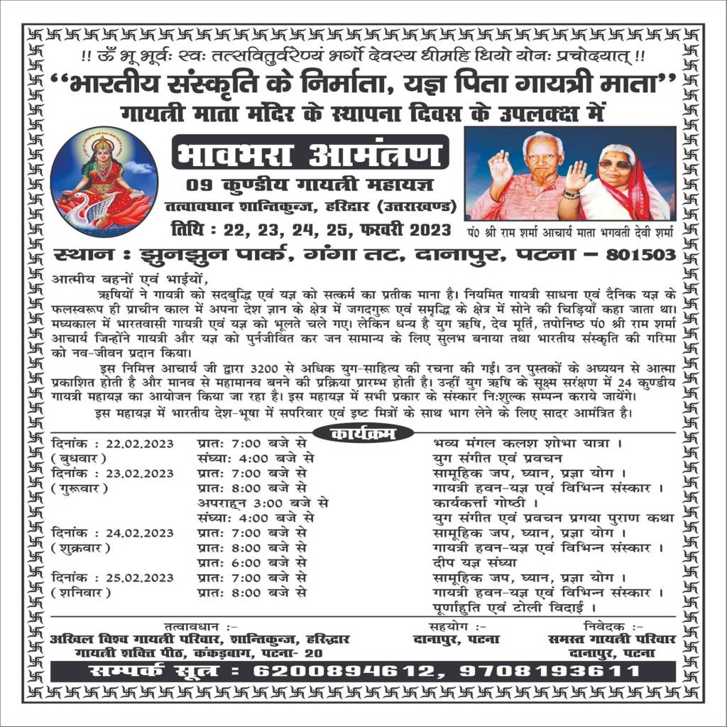 इसी सेगमेंट में अरुण वर्मा भाई साहिब द्वारा भेजे गए दानापुर गायत्री शक्तिपीठ के स्थापना दिवस के अवसर पर हो रहे 9 कुंडीय गायत्री महायज्ञ के बारे में जानकारी देता पोस्टर।