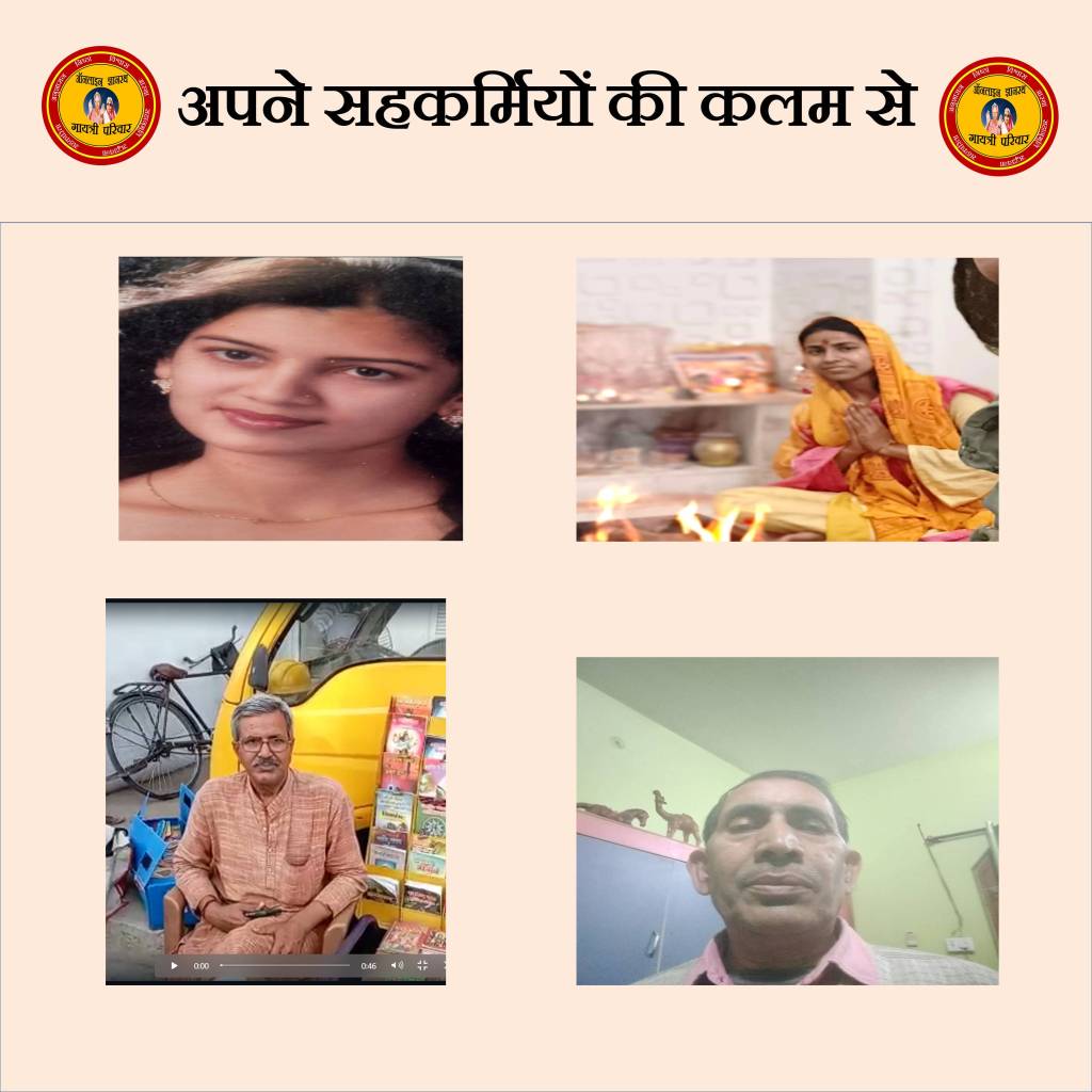 परम आदरणीय चाचाजी आपके श्री चरणों में नतमस्तक होकर भाव भरा सादर प्रणाम स्वीकार करें।आज मैंने तीन घरों में गृहे गृहे गायत्री महायज्ञ संपन्न कराया।परम पूज्य गुरुदेव की कृपा से तीनों यज्ञ निर्विघ्न रूप से संपन्न हुए। मैंने सभी को अखंड ज्योति पत्रिका भी वितरण किया। मुझसे जितना हुआ मैंने गुरुदेव के विचारों को उन सभी लोगों के हृदय में स्थापित करने की पूरी कोशिश की। बोलते-बोलते मेरा गला रूंध सा गया था परंतु गुरुदेव ने शक्ति दी और मैंने सभी को बहुत अच्छे से समझाया।अब आगे गुरूदेव की महिमा, जैसा मार्गदर्शन करते जाएंगे वैसा मैं करती जाउंगी। मैंने बलिवैश्व यज्ञ के बारे में भी बताया। उनमें से दो महिलाएं बलिवैश्व के लिए तैयार भी हो गई है। सचमुच में मन बहुत प्रसन्न हो गया। हे गुरुदेव आपकी महिमा अपरम्पार है।जय गुरुदेव।