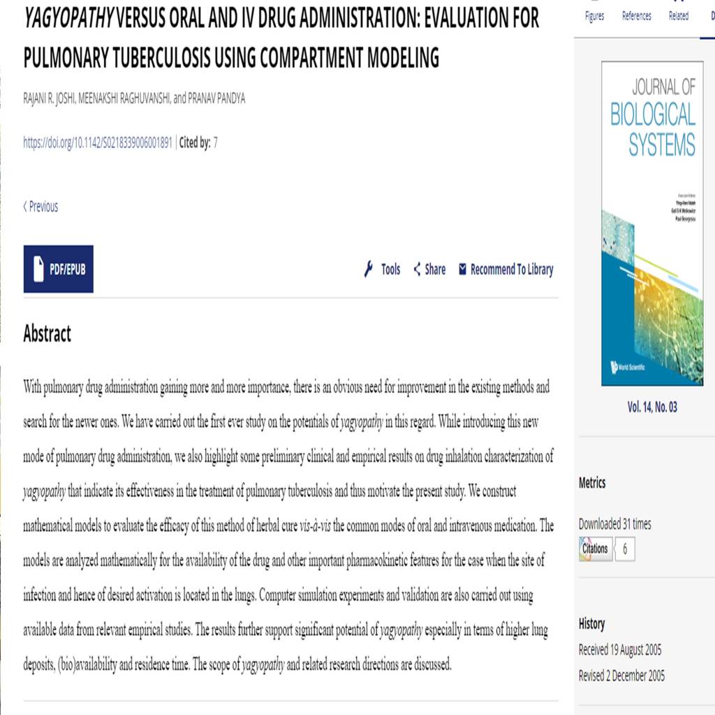 श्रद्धेय डॉ. प्रणव पण्ड्या जी का कहना है कि देश-विदेश में आयोजित हो रहे यज्ञों का उद्देश्य मानवता को समग्र स्वास्थ्य उपलब्ध कराना है। हम अपनी प्रयोगशाला में जिन औषधियों को जीवनी शक्ति बढ़ाने के लिए उपयोगी पाते हैं, अपने यज्ञों में उन्हीं का प्रयोग करते हैं। गायत्री परिवार के कार्यकर्ता देश/विदेश में इन प्रयोगों के लाभकारी परिणामों का सर्वेक्षण अध्ययन कर रहे हैं। हमने इस लेख के साथ ही एक सैंपल रिसर्च स्टडी का स्क्रीनशॉट शामिल किया है। यह स्क्रीनशॉट देव संस्कृति यूनिवर्सिटी के Department of Ayurveda & Holistic Health द्वारा प्रकाशित रिसर्च पेपर के Abstract का संक्षिप्त विवरण है। रिसर्च पेपर तो बहुत ही लम्बा है लेकिन हमारी रूचि होने के कारण हमने इसे पढ़ा और समझने का प्रयास किया। इस पेपर में वर्णन की गयी रिसर्च में बीमारी के लिए तीन मार्गों से दवाई देने की तुलना की गयी है। यह तीन मार्ग हैं : 1) टेबलेट/कैप्सूल, 2) Intravenous (IV) injection और 3) यज्ञ के उठने वाला धुआँ।यह रिसर्च पेपर सिंगापुर से प्रकाशित होने वाले इंटरनेशनल रिसर्च Journal में प्रकाशित किया गया है और विश्व भर में विख्यात है। यह केवल एक ही उदहारण है, DSVV से प्रकाशित हो रहे अनेकों रिसर्च रिजल्ट्स परम पूज्य गुरुदेव के विज़न को सार्थक कर रहे हैं।