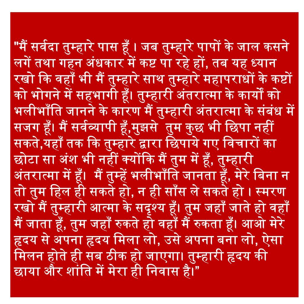 “मैं सर्वदा तुम्हारे पास हूँ । जब तुम्हारे पापों के जाल कसने लगें तथा गहन अंधकार में कष्ट पा रहे हों, तब यह ध्यान रखो कि वहाँ भी मैं तुम्हारे साथ तुम्हारे महापराधों के कष्टों को भोगने में सहभागी हूँ। तुम्हारी अंतरात्मा के कार्यों को भलीभाँति जानने के कारण मैं तुम्हारी अंतरात्मा के संबंध में सजग हूँ। मैं सर्वव्यापी हूँ,मुझसे तुम कुछ भी छिपा नहीं सकते,यहाँ तक कि तुम्हारे द्वारा छिपाये गए विचारों का छोटा सा अंश भी नहीं क्योंकि मैं तुम में हूँ, तुम्हारी अंतरात्मा में हूँ। मैं तुम्हें भलीभाँति जानता हूँ, मेरे बिना न तो तुम हिल ही सकते हो, न ही साँस ले सकते हो । स्मरण रखो मैं तुम्हारी आत्मा के सदृश्य हूँ। तुम जहाँ जाते हो वहाँ मैं जाता हूँ, तुम जहाँ रुकते हो वहाँ मैं रुकता हूँ। आओ मेरे हृदय से अपना हृदय मिला लो, उसे अपना बना लो, ऐसा मिलन होते ही सब ठीक हो जाएगा। तुम्हारी हृदय की छाया और शांति में मेरा ही निवास है।”