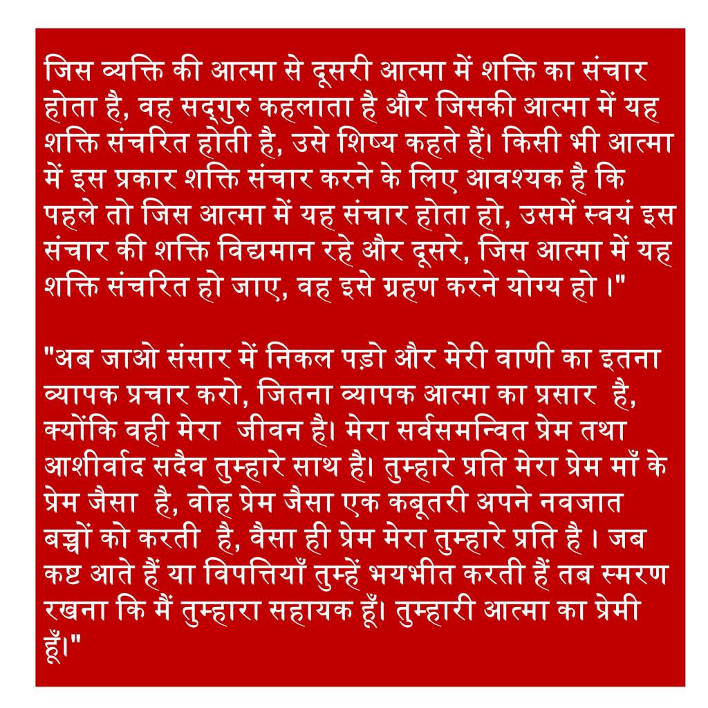 “जिस व्यक्ति की आत्मा से दूसरी आत्मा में शक्ति का संचार होता है, वह सद्गुरु कहलाता है और जिसकी आत्मा में यह शक्ति संचरित होती है, उसे शिष्य कहते हैं। किसी भी आत्मा में इस प्रकार शक्ति संचार करने के लिए आवश्यक है कि पहले तो जिस आत्मा में यह संचार होता हो, उसमें स्वयं इस संचार की शक्ति विद्यमान रहे और दूसरे, जिस आत्मा में यह शक्ति संचरित हो जाए, वह इसे ग्रहण करने योग्य हो ।”