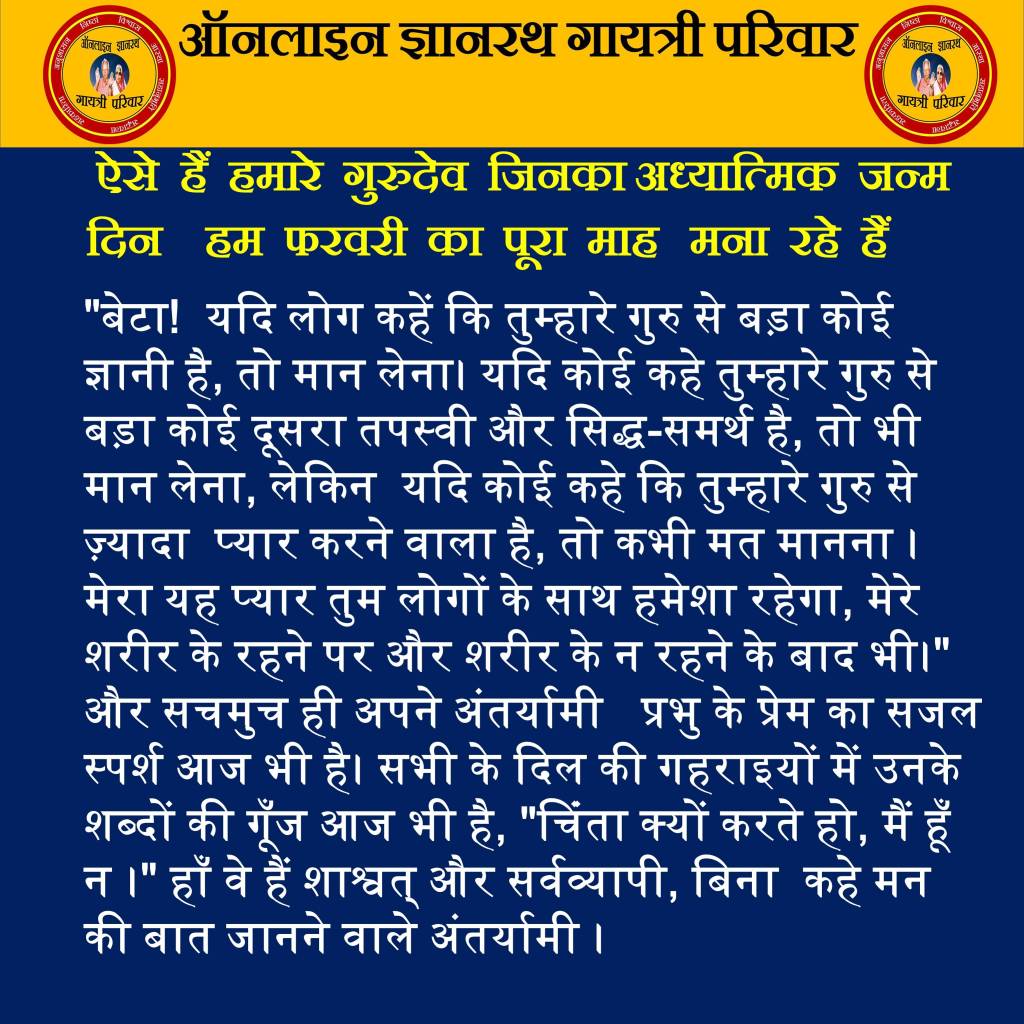 परमपूज्य गुरुदेव का आध्यात्मिक जन्मदिन मनाने हेतु सम्पूर्ण फ़रवरी माह में मंगलवेला के ज्ञानप्रसाद से लेकर शुभरात्रि सन्देश तक समस्त योगदान परम पूज्य गुरुदेव को ही समर्पित करने का संकल्प लिया गया है, गुरुदेव इसे पूर्ण करने में अवश्य मार्गदर्शन करेंगें, ऐसा हमारा अटूट विश्वास है।