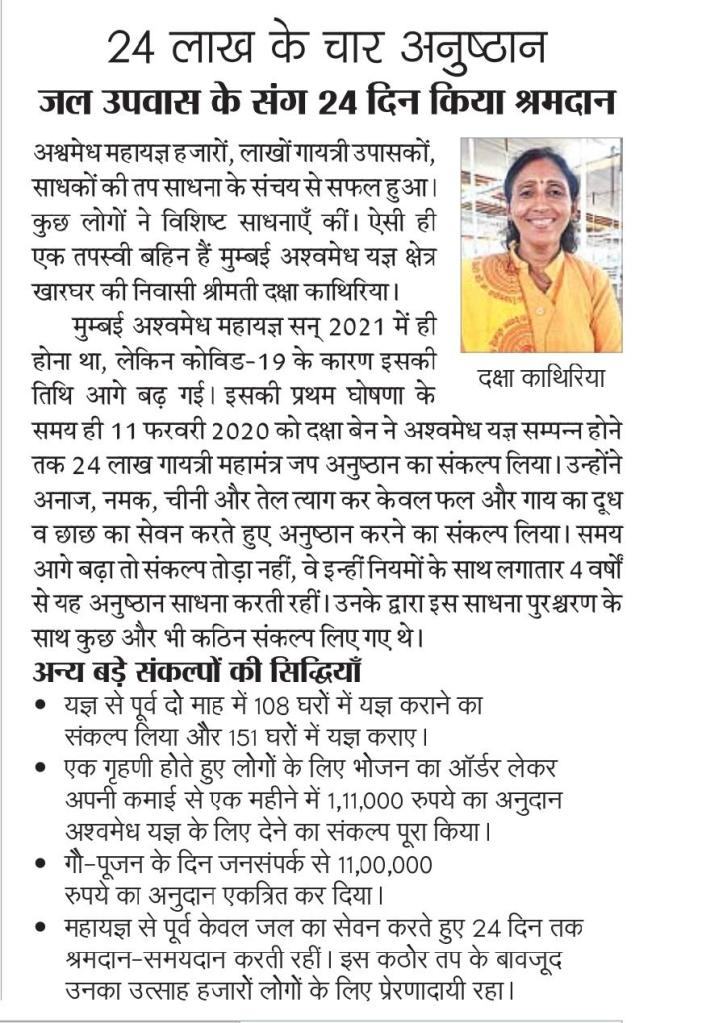 6. छठे पॉइंट में आदरणीय दक्षा कथिरिया बहिन जी के समर्पण को नमन करते हुए शेयर कर रहे हैं जिन्होंने 24 लाख के चार अनुष्ठान किए और 24 दिन जल उपवास किया। जय गुरुदेव।