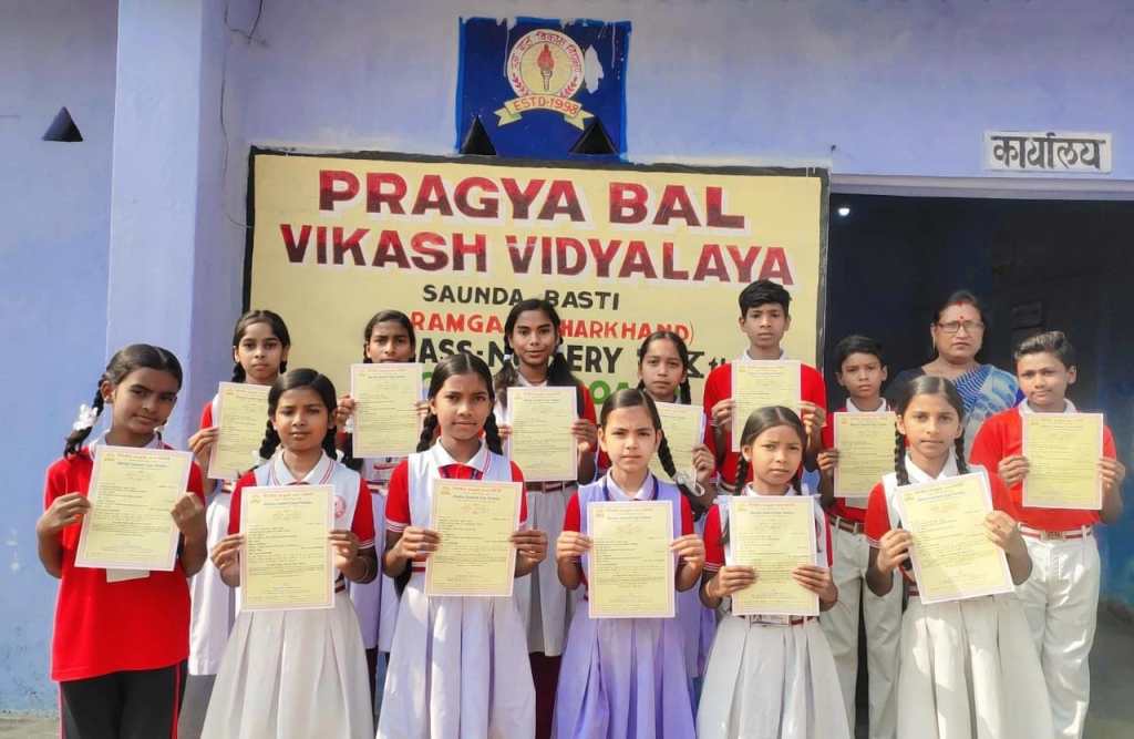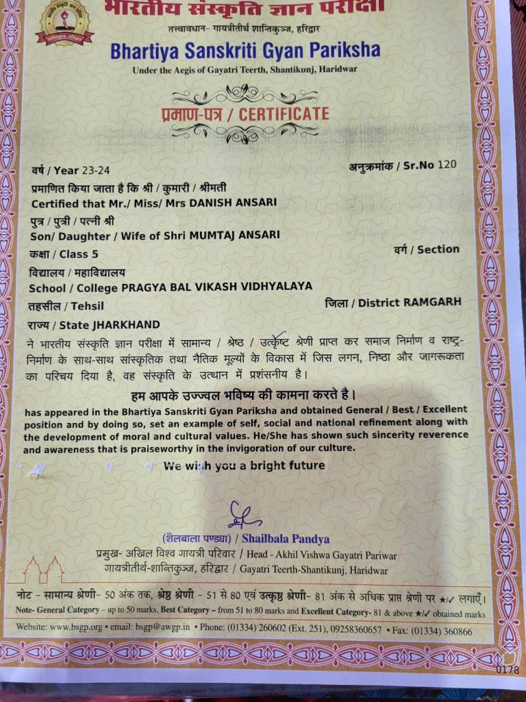 4. चौथा पॉइंट हमारी साधना बहिन जी द्वारा चलाए जा रहे विद्यालय, “प्रज्ञा बाल विकाश विद्यालय” से सम्बंधित है। यह विद्यालय झारखण्ड में सौंदा बस्ती में है। शांतिकुंज द्वारा आयोजित “भारतीय संस्कृति ज्ञान परीक्षा” में सफल हुए विद्यार्थिओं का एक चित्र बहिन जी ने हमें भेजा है जिसे हम परिवार के साथ शेयर कर रहे हैं। इसके साथ ही दिए जाने वाले एक प्रमाण पत्र का चित्र भी शेयर कर रहे हैं। बहिन जी के परिश्रम को recognise करते हुए परिवार नमन करता है।