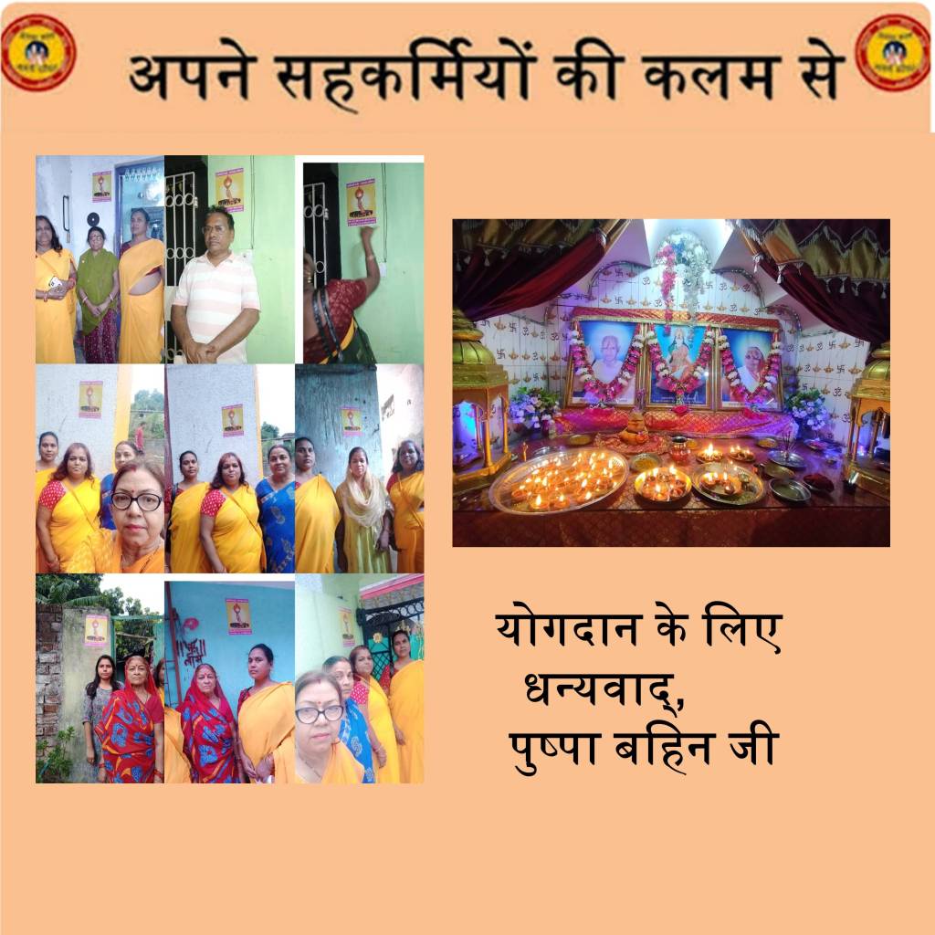 i)आदरणीय पुष्पा बहिन जी गुरुकार्य में सदैव सक्रीय रहती हैं, उनकी सक्रियता दर्शाती दो फोटो शेयर कर रहे हैं जो आदित्यपुर महिला मंडल द्वारा गंगा सप्तमी के पावन अवसर पर ली गयी थीं। बहिन जी की सक्रियता दर्शाता एक पोस्टर भी शेयर कर रहे हैं जो गुरुवार 23 मई 2024, बुद्ध पूर्णिमा से सम्बंधित है। आशा करते हैं कि इस महान आध्यात्मिक प्रयोग में अधिक अधिक साथी सम्मिलित होंगें।