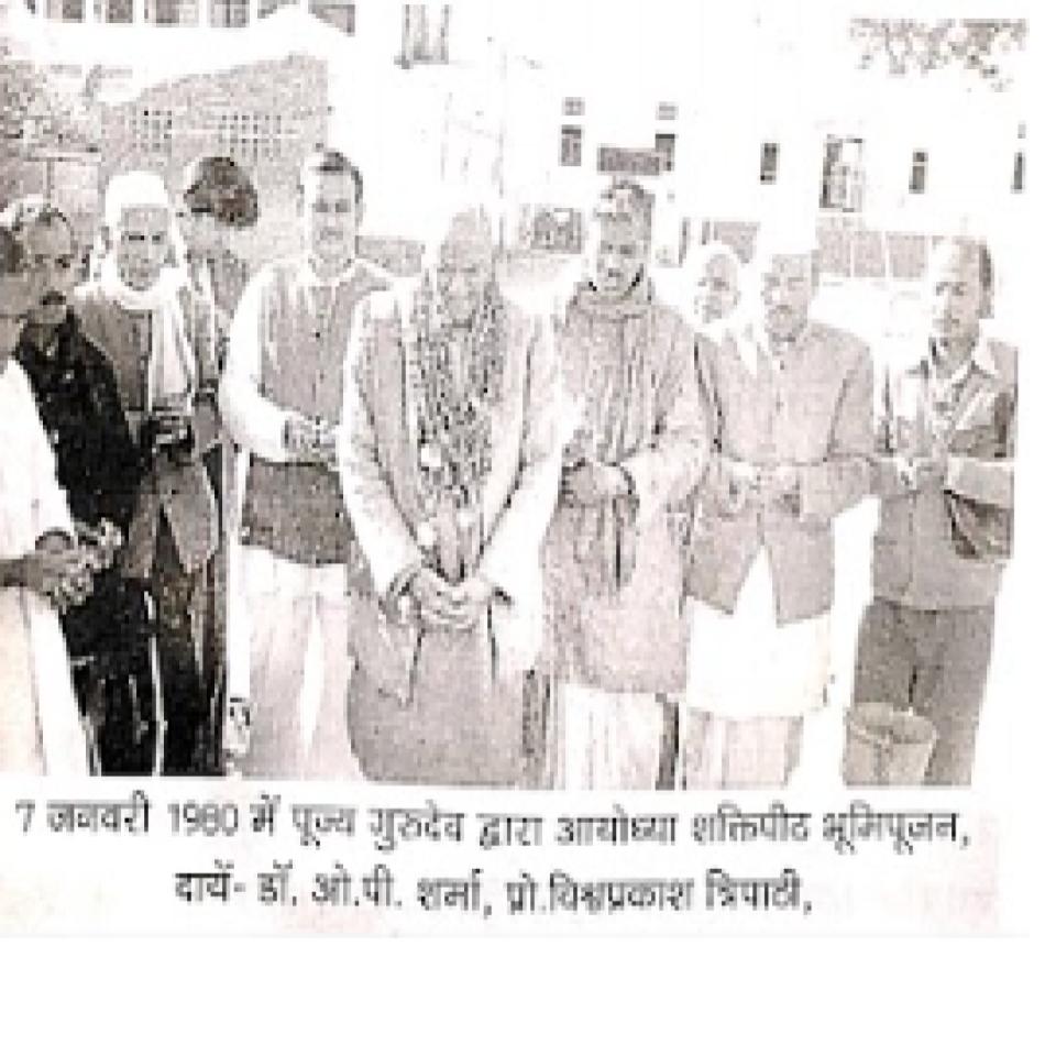 बाद में अयोध्या शक्तिपीठ के लिए काफिला चला। परम पूज्य के स्वागत के लिए ऋषियों/महामानवों के नाम से 108 गेट बनाये गये थे । इतना भव्य एवं स्नेहपूर्ण स्वागत कभी किसी को देखने के लिए नहीं मिला था । महर्षि वसिष्ठ, विश्वामित्र, याज्ञवल्क्य द्वार आदि नाम पर रखे गये थे । निर्धारित समय पर कनक भवन के पास पूजन हेतु गुरुदेव पधारे, साथ में लखनऊ के पुराने कार्यकर्त्ता पोस्टल विभाग के श्री आनन्द सक्सेना, श्री केसरी कपिल जी, हम (डॉ.ओ.पी.शर्मा), प्रो. विश्वप्रकाश एवं सिंह साहब, डॉ. हरिवंश शुक्ला, पाण्डेय जी, सब-रजिस्ट्रार फैजाबाद ट्रेजरी आदि उपस्थित थे। परिसर के गेट पर प्रवेश करते ही जमीन की मालकिन रानी साहिबा गोण्डा ने हाथ जोड़कर परम पूज्य गुरुदेव को नमन करते हुए कहा,“आपके चरणों में समर्पित है, स्वीकार करें”। बहुत सस्ती मात्र 5000 रुपए प्रति बीघा ज़मीन थी । परम पूज्य गुरुदेव ने स्वयं फावड़ा चलाकर भूमि पूजन किया। हजारों की उपस्थिति में भव्य एवं अभूतपूर्व ऐतिहासिक कार्यक्रम सम्पन्न हुआ।