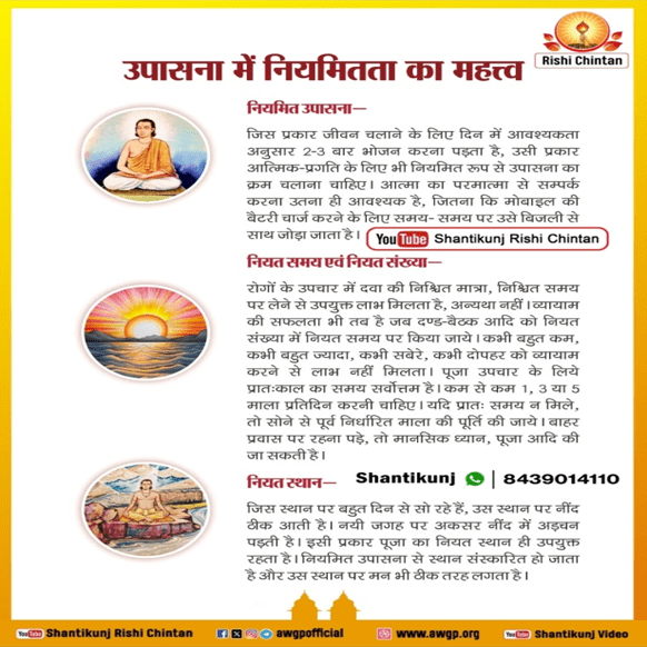 नियमितता में बड़ी शक्ति है। जिस प्रकार चाय पीने वालों को, सिगरेट पीने वालों को, मदिरापान करने वालों को समय आने पर “तलब” उठती है, वैसी ही “तलब” नियत समय पर साधना के लिए उठने लगे तो समझना चाहिए कि उस क्रम व्यवस्था ने साधक के स्वभाव में स्थान प्राप्त कर लिया। जब हाथों, नेत्रों आदि को नियत विधि व्यवस्था, नियत स्थान, नियत क्रम, नियत कार्य जुटाने के लिये प्रैक्टिस हो जाए तो समझना चाहिये कि प्रारंभिक कक्षा (सामान्य साधना स्तर) वाली साधना का क्रम पूर्ण हो गया है ।