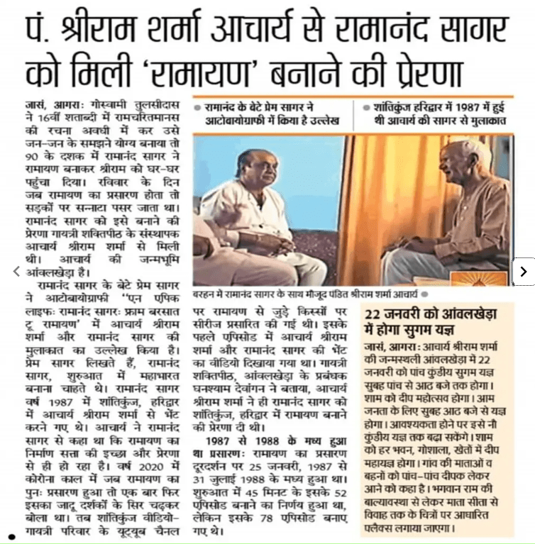 1987 में रामानन्द सागर हरिद्वार स्थित युगतीर्थ शांतिकुंज में हमारे गुरुदेव पंडित श्रीराम शर्मा आचार्य जी से भेंट करने आए। गुरुदेव के कक्ष की ओर जाते समय सीढ़ियों पर चढ़ते समय सागर जी को गुरुदेव में उसी दिव्यरुपी साधक के दर्शन हुए, जिसे वे स्वप्न और एकांत में कई बार देख चुके थे। गुरुदेव से भेंटवार्ता करने के पश्चात रामानंद जी ने उन्हें अपना प्रेरणास्रोत स्वीकारते हुए कहा,