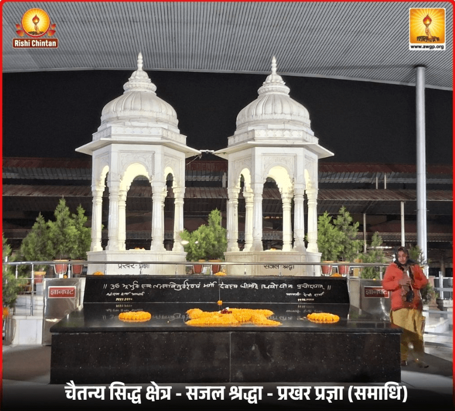 चर्चा यहीं पूरी हुई। इसके बाद गुरुदेव के बताए स्थान पर दो छतरियों का निर्माण शुरू हुआ। उसके निर्माण के लिए विभिन्न तीर्थों से जल-रज और आवश्यक शिलायें मंगाई गयीं जिन्हें छतरी के गर्भ में स्थापित किया गया। निर्माण के दौरान प्रतिदिन गुरुदेव यहाँ आते और निरिक्षण करते। कभी-कभार पत्थरों को छू कर भी देखते। जो परिजन वहां पे मौजूद होते उन्हें लगता गुरुदेव अपने दिव्य स्पर्श से उस सामग्री में प्राण चेतना का संचार कर रहे हैं। 1982 की वसंत पंचमी को वह स्मारक बन कर पूरा हो गया और उस समय गुरुदेव ने उसका नामकरण किया “प्रखर प्रज्ञा -सजल श्रद्धा “I स्थापना के समय माता जी भी उपस्थित थीं। परिजनों को यह आशंका हो रही थी कि शायद गुरुदेव/माता जी अपनी लीला समेटने की तैयारी कर रहे हैं.