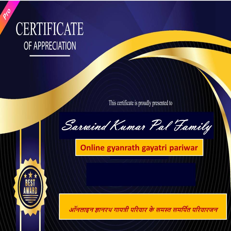 इस अद्भुत योगदान के लिए ऑनलाइन ज्ञानरथ गायत्री परिवार द्वारा Certificate of Appreciation प्रदान किया जाना एक गर्व एवं सौभाग्य का क्षण हैं। हम सब सरविन्द पाल परिवार को बधाई देते हैं एवं कामना करते हैं कि परिवार के पांचों सदस्यों को गुरुवर का अनवरत संरक्षण मिलता रहे।