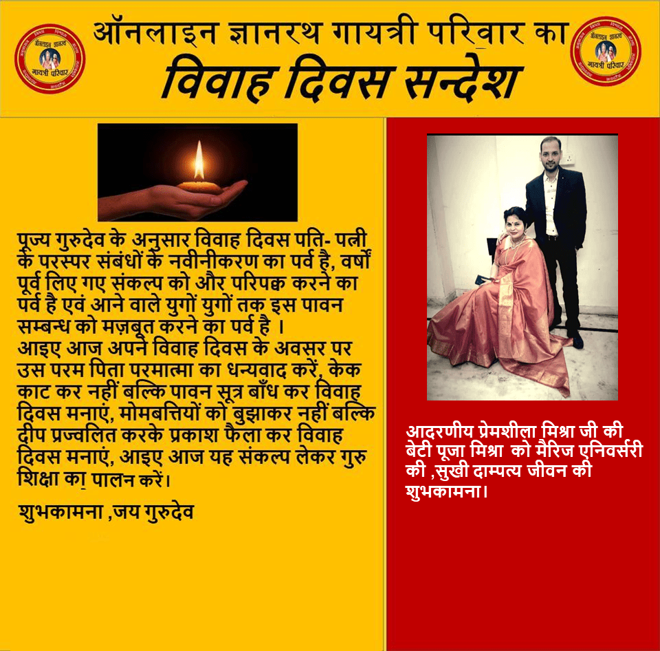 आज के लेख में आदरणीय प्रेमशीला मिश्रा जी की बेटी पूजा मिश्रा मैरिज एनिवर्सरी का सन्देश भी शामिल किया गया है। मैरिज एनिवर्सरी तो कल थी लेकिन हमें आधी रात को मैसेज मिला था, हमारे यहाँ सुबह होते होते भारत में दिन का अंत आ पंहुचा था।