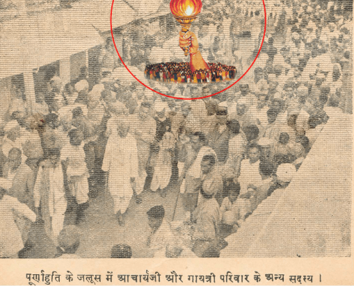 पूर्णाहुति के बाद जो विशाल जुलूस निकाला गया उसके विषय में तो सभी मथुरा निवासी यह कह रहे थे कि ऐसा जुलूस शायद ही कभी यहाँ निकला हो। जुलूस के आगे नारद, राजा हरिश्चन्द्र, भगवान बुद्ध, महात्मा गाँधी, महर्षि दयानन्द आदि के दर्शनीय चित्र झाँकियाँ सजा कर निकाले गये थे। गायत्री मंत्र से युक्त यज्ञ-भगवान का रथ 10 सफेद अश्वों के साथ जुलूस के मध्य में चल रहा था। उसके पीछे सैंकड़ों शाखाओं के याज्ञिक अपने-अपने झंडे लेकर, जिन पर गायत्री मंत्र लिखा था, चल रहे थे। “गायत्री माता” तथा “यज्ञ भगवान” के जयघोष से आकाश गूँज रहा था। “पूज्य आचार्य जी की जय हो, हमारा युग निर्माण का संकल्प पूरा हो विश्व का कल्याण हो” आदि के नारे लगाये जा रहे थे। आचार्य जी जुलूस के साथ पैदल चल रहे थे। रास्ते के सब मकानों की छतें और सड़कें जुलूस देखने के लिये एकत्रित जनसमूह से भरी थीं। जुलूस पर निरन्तर फूलों की वर्षा हो रही थी और थोड़ी-थोड़ी दूर पर आचार्य जी को फूलों के हार पहिनाये जा रहे थे। इस अद्वितीय समारोह के पचासों स्थानों पर फोटो खींचे गये।