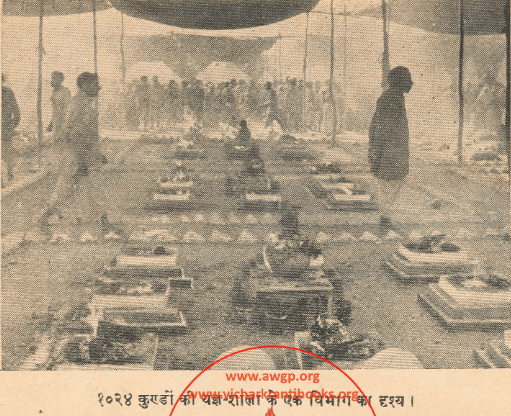 याज्ञिकों को ठहराने के लिये जो कई हजार तम्बू लगाये गये थे उनके नाम नारद नगर, व्यास नगर वशिष्ठ नगर, विश्वामित्र नगर आदि ऐसे सुन्दर रखे गये थे कि उनको सुनते ही पुरातन ऋषियों के जमाने की याद आ जाती थी। तीन मील के क्षेत्र में फैले हुए यह नगर बिजली के प्रकाश में ऐसे सुन्दर दिखाई पड़ते थे कि इनके संचालकों को धन्यवाद दिये बिना रहा नहीं जाता था। यज्ञमंडप की सजावट भी अद्वितीय थी। विशालकाय द्वार के अन्दर माता गायत्री का सुन्दर, मनमोहक, कलायुक्त मन्दिर, आचार्य और ब्रह्म के लिये अति सुन्दर सजावट युक्त मंडप परम दर्शनीय था। सामने 1024 कुण्डों की रचना शास्त्रोक्त रीति से पीले वस्त्र युक्त छवि इतनी सुन्दर थी कि देखने वाले अपने सौभाग्य की सराहना करते थे। हवन के समय पीतवस्त्रधारी 3000 तपस्वी याज्ञिकों के समुदाय को एक साथ आहुतियाँ देते देखकर सतयुग की याद आ जाती थी।