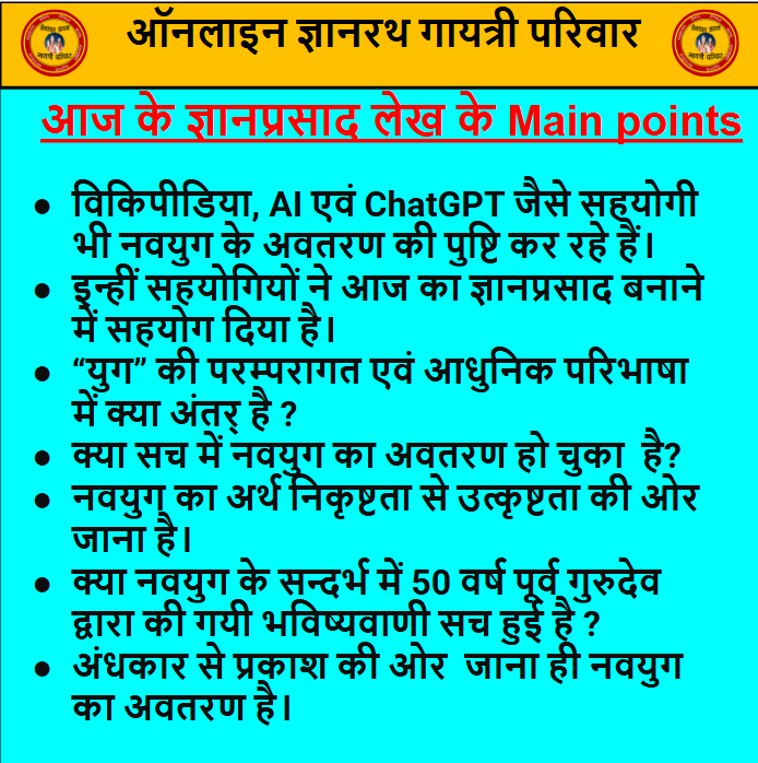 जो भी हो निष्कर्ष यही निकला कि लेख को भलीभांति समझकर,सरल करके ऑनलाइन ज्ञानरथ गायत्री परिवार के मंच पर प्रस्तुत किया जाये। इतनी अधिक जानकारी, इतना अधिक ज्ञान इक्क्ठा हो गया कि आज और कल उन बेसिक तथ्यों को समझने की आवश्यकता है। अलग-अलग Sources से ज्ञान प्राप्त होने के कारण रिपीट होना स्वाभाविक है जिसके लिए क्षमाप्रार्थी हैं।