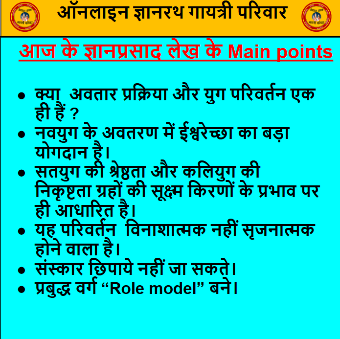 निकट भविष्य में ही “युग परिवर्तन” प्रस्तुत होने वाला है इसमें किसी को सन्देह नहीं होना चाहिए। जिन्हें दूरदर्शी आँखें प्राप्त हों,यदि वोह नवयुग को लाने के लिए तीव्र गति से जुटाए जा रहे साधनों को बारीकी से देखें और समझें तो उन्हें विश्वास हो जायेगा कि यह एक ऐसी सुनिश्चित नियति एवं प्रारब्ध है जिसे किसी भी प्रकार से टालना संभव नहीं है। विधाता की कलम ने एक बार जो लिख दिया उसे वह स्वयं भी नहीं टाल सकते। सीताहरण के समय भगवान् राम लक्ष्मण जी से कहते हैं, “विधना का चक्र प्रिय भाई लक्ष्मण- – -” अर्थात “हे लक्ष्मण! यह जो कुछ घट रहा है, वह हमारे वश में नहीं है। यह सब विधाता (ईश्वर) की रचना है, उसकी योजना है, जो समय चक्र के अनुसार चल रही है।” भगवान् भी विधाता के निर्णय के आगे नतमस्तक होते हैं
