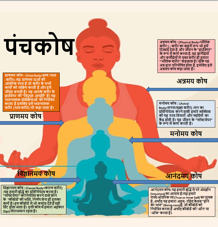 “पंचकोषों का खुलना”, साधना या आध्यात्मिक उन्नति के दौरान इन परतों का शुद्ध और सक्रिय होना कहा गया है। इसका अर्थ है कि साधक केवल स्थूल शरीर तक सीमित न रहकर अपनी आंतरिक परतों के बारे में अनुभव करने लगता है/जानने लगता है।