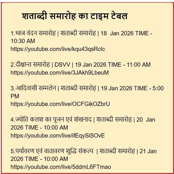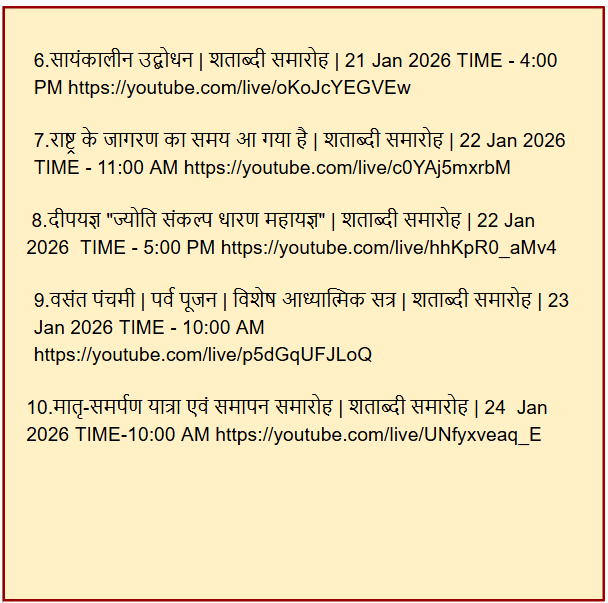 आज के ही लेख में वैरागी द्वीप में हो रहे शताब्दी समारोह का टाइम टेबल दिया गया जिसमें अलग-अलग गतिविधिओं के समय,तिथियां और यूट्यूब लिंक्स दिए गए हैं। लाइव होने के कारण यह लिंक्स Clickable नहीं हैं,केवल कुछ एक ही कॉपी/पेस्ट करके देखे जा सकते हैं। हमें विश्वास है कि यह सारी जानकारी शांतिकुंज की वेबसाइट पर उपलब्ध है लेकिन फिर भी हम यहाँ शेयर करके गिलहरी जैसा योगदान करना अपना कर्तव्य समझते हैं।
