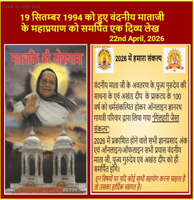 कल फिर एक वीडियो प्रस्तुत की जाएगी। वंदनीय माताजी के महाप्रयाण को समर्पित यह दिव्य/दुर्लभ/मार्मिक वीडियो जिसे आदरणीय देवेश जी ने Archive से ढूंढ कर हमारे लिए प्रस्तुत की, किस के भी आंसू छलका सकती है।