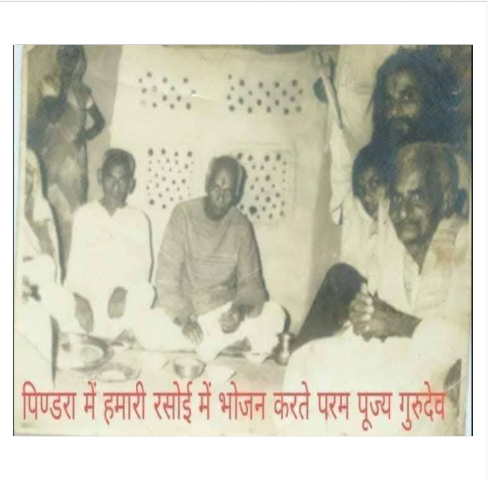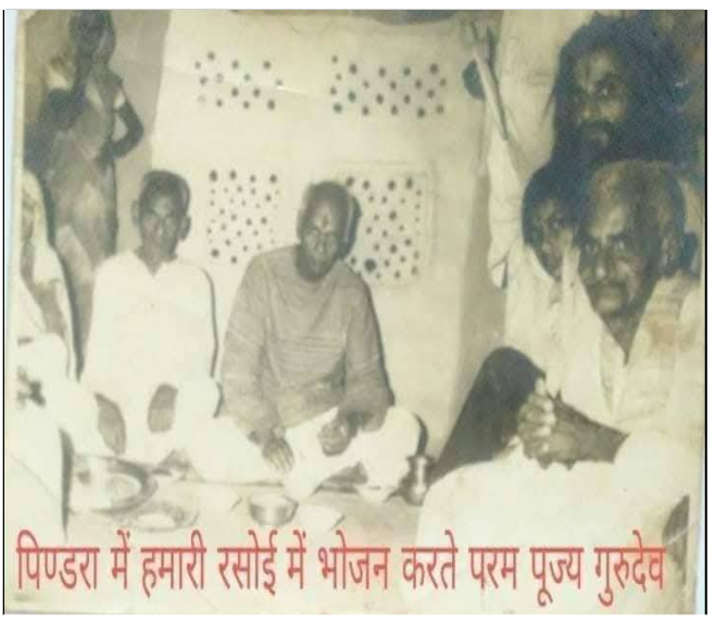 रघुवंशी जी लिखते हैं कि परम पूज्य गुरुदेव को स्टेज में पहुंचाकर बड़े भाई साहब के पास गया और कहा कि गुरुदेव ने कहा है कि कल सुबह हमारे घर पिण्डरा जायेंगे और भोजन भी वहीं करेंगे। बड़े भाई साहब के साथ ही रीवा के श्री प्रमोद सिंह भी खड़े थे, जिनकी बसें सेवा में लगी थीं, बड़े भाई साहब ने कहा कि तू पागल तो नहीं है, इतनी जल्दी कैसे व्यवस्था होगी? श्री प्रमोद सिंह ने कहा कि सब हो जायेगा, चलिए पिण्डरा चलते हैं। उन्होंने अपनी बसों में कार्यकर्त्ता भरे और रात में ही टेसू के फूल तोड़े और सड़क से लगभग एक किलोमीटर घर तक के मार्ग की ऐसी सजावट की कि हम स्वयं ही नहीं पहचान पाये कि हम आ कहां गये। हम तो परम पूज्य गुरुदेव के आगे- आगे चल रहे थे। सारा गांव पलकें बिछाये पूज्य गुरुदेव का स्वागत कर रहा था, हमने पैर छूकर प्रणाम करने के लिए मना किया तो गुरुदेव ने हमें डांट दिया, चल प्रणाम करने दे। परम पूज्य गुरुदेव हमारे पिताजी स्वतंत्रता संग्राम सेनानी स्व. श्री राजेन्द्र बहादुर सिंह से स्वतंत्रता आन्दोलन में गांव की भूमिका की जानकारी लेते रहे। प्रणाम का क्रम समाप्त होते ही पूज्यवर स्वयं उठकर अन्दर बढ़े, जैसे पहले भी कभी आ चुके हों। आंगन से सीधे रसोईघर में पहुँच गए, जहाँ माँ भाव विभोर होकर गुरुदेव के लिए भोजन पका रहीं थीं। हमने परम पूज्य गुरुदेव तथा साथ चल रहे पं. लीलापत शर्मा जी के लिए भोजन की व्यवस्था अलग से दालान में बनाई थी, तथा शेष काफिले में चल रहे लगभग 200 व्यक्तियों की भोजन व्यवस्था बाहर चौपाल में की थी लेकिन यह क्या, पूज्य गुरुदेव ने रसोई में ही माँ से कहा कि “लाओ, पट्टा यहीं रखो और क्या-क्या बनाया है? सब एक एक कटोरी में यहीं रखो।”